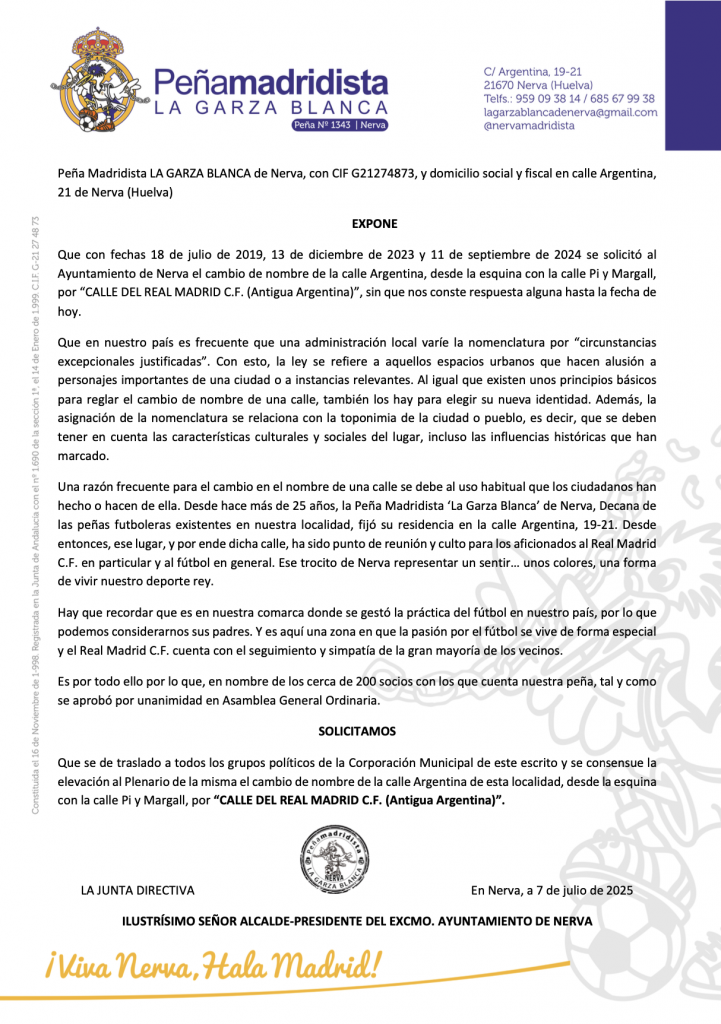 La Peña Madridista ‘La Garza Blanca’ de Nerva, en nombre de sus casi 200 socios, ha vuelto a solicitar al Ayuntamiento de Nerva con fecha 7 de julio de 2025 que, “los grupos políticos de la Corporación Municipal consensúen la elevación a Pleno de la petición del cambio de nombre de la calle Argentina, desde la esquina con la calle Pi y Margall, por calle del Real Madrid CF-(Antigua Argentina)», tal y como se aprobó por unanimidad en Asamblea General Ordinaria.